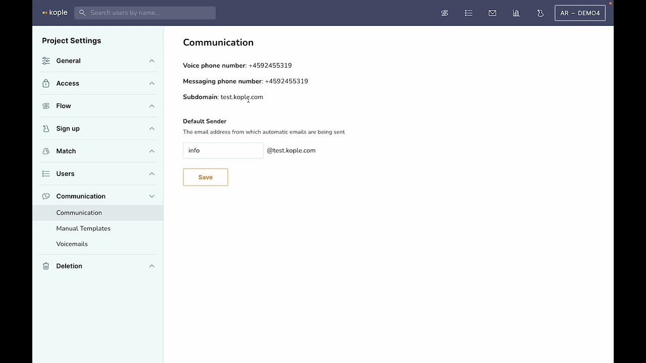 Communication shows you what phone number is used for calls and messaging and what your subdomain email is. This is the email you will be sending from and receiving to. It does not matter what comes before the @ when receiving emails as all inbound communication is shown on the relevant user or in the inbox if there is no user associated.