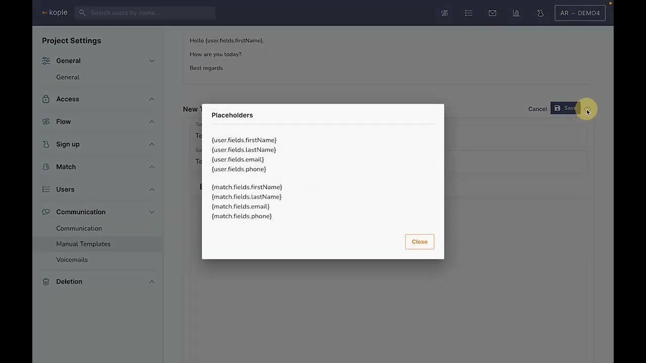 Manual templates can be set up under the “Communications” menu. You can decide on a template name, subject and content including autofilled elements like name and contact info. If you click on the pencil icon to edit a template you can click on “Browse placeholders” to see the available autofilled elements that you can put into the template.