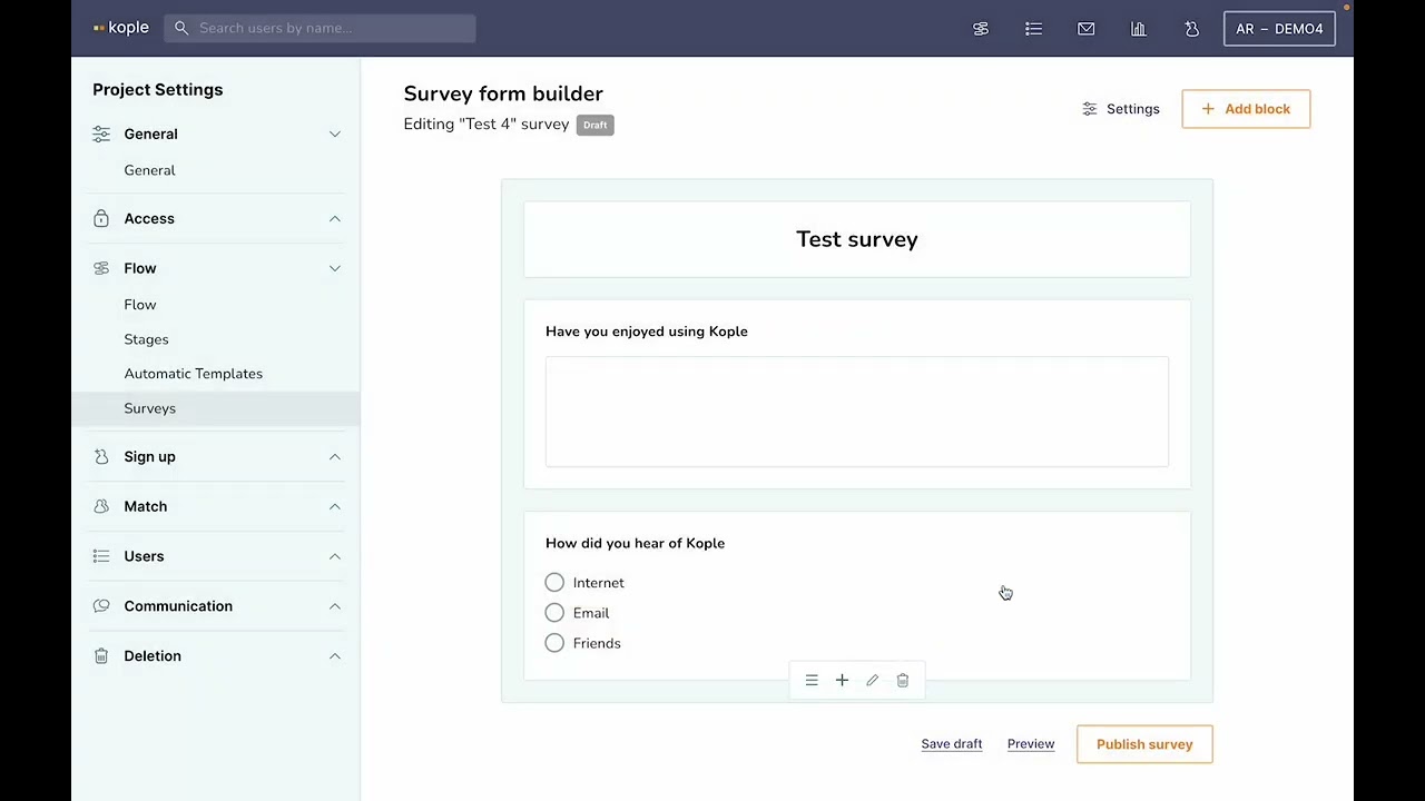 Surveys can also be built in Kople and can be sent to the users both automatically and manually or you can fill them out on their behalf.