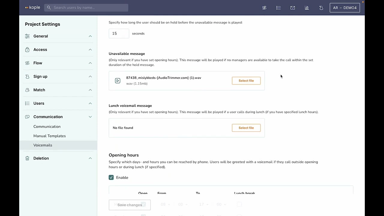 Voicemails under the “Communications” menu can be set up if you have integrated phone. At the bottom of the page you can enable and choose opening hours. Without opening hours you just need a default message – with opening hours all of the messages should preferably be uploaded.