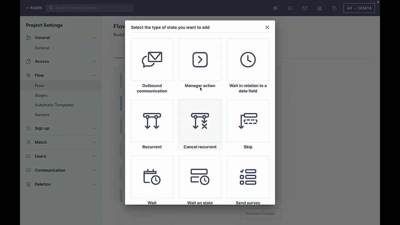 4. Wait on state (wait for x amount of time from entering another state – can be used to connect with the flow of the users match)